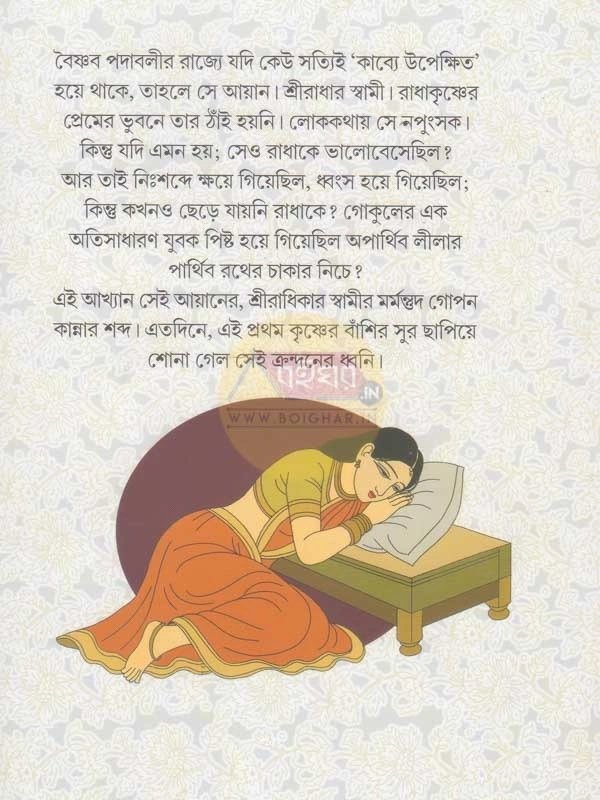 বৈষ্ণব পদাবলীর রাজ্যে যদি কেউ সত্যিই 'কাব্যে উপেক্ষিত' হয়ে থাকে, তাহলে সে আয়ান। শ্রীরাধার স্বামী। রাধাকৃষ্ণের প্রেমের ভুবনে তার ঠাঁই হয়নি। লোককথায় সে নপুংসক। কিন্তু যদি এমন হয়; সেও রাধাকে ভালোবেসেছিল ? আর তাই নিঃশব্দে ক্ষয়ে গিয়েছিল, ধ্বংস হয়ে গিয়েছিল; কিন্তু কখনও ছেড়ে যায়নি রাধাকে? গোকুলের এক অতিসাধারণ যুবক পিষ্ট হয়ে গিয়েছিল অপার্থিব লীলার পার্থিব রথের চাকার নিচে? এই আখ্যান সেই আয়ানের, শ্রীরাধিকার স্বামীর মর্মন্তুদ গোপন কান্নার শব্দ। এতদিনে, এই প্রথম কৃষ্ণের বাঁশির সুর ছাপিয়ে শোনা গেল সেই ক্রন্দনের ধ্বনি।